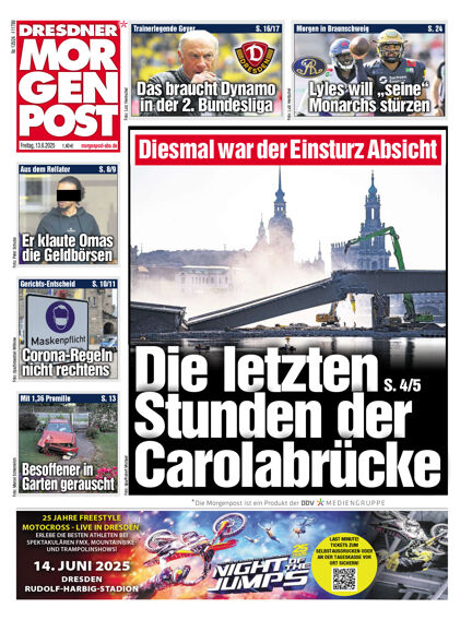 Die Dresdner Morgenpost ist eine der führenden Kaufzeitungen in den neuen Bundesländern. Ob beim Aufdecken von Politskandalen, dem Engagement für den regionalen Sport oder im Einsatz für günstige Einkaufsmöglichkeiten: Das Erfolgsrezept der Dresdner Morgenpost ist ehrlicher, engagierter Journalismus, der die Leser ernst nimmt, unterhält und sich für ihre Interessen einsetzt. Ein Erfolgsrezept, das sich auch in Zahlen ausdrückt: In der Landeshauptstadt Dresden ist sie seit Jahren Marktführerin in diesem Segment. Für das zur Morgenpost gehörende Newsportal TAG24 werden alle aktuellen News aus der Redaktion digital optimiert und so auch online und mobil verfügbar.